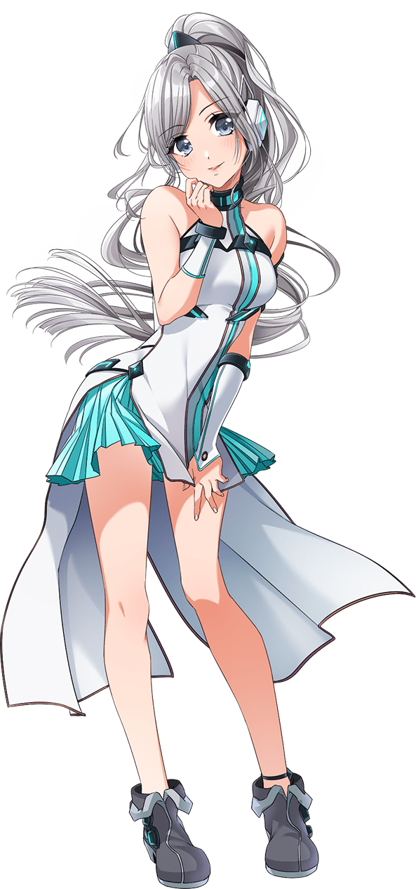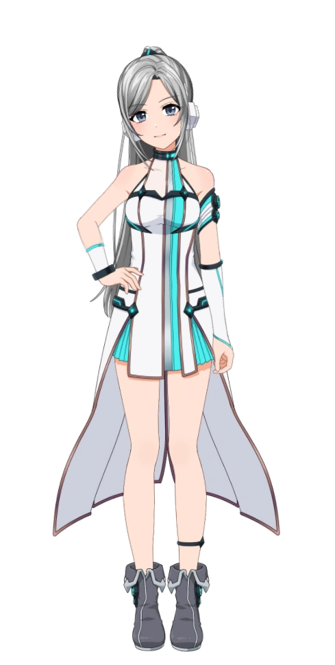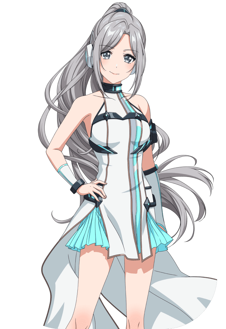 Ibuki is a tall girl with a well-maintained figure. She has grey hair tightly pulled into a ponytail. Her front bangs are parted, and she has blue-grey eyes with light skin.